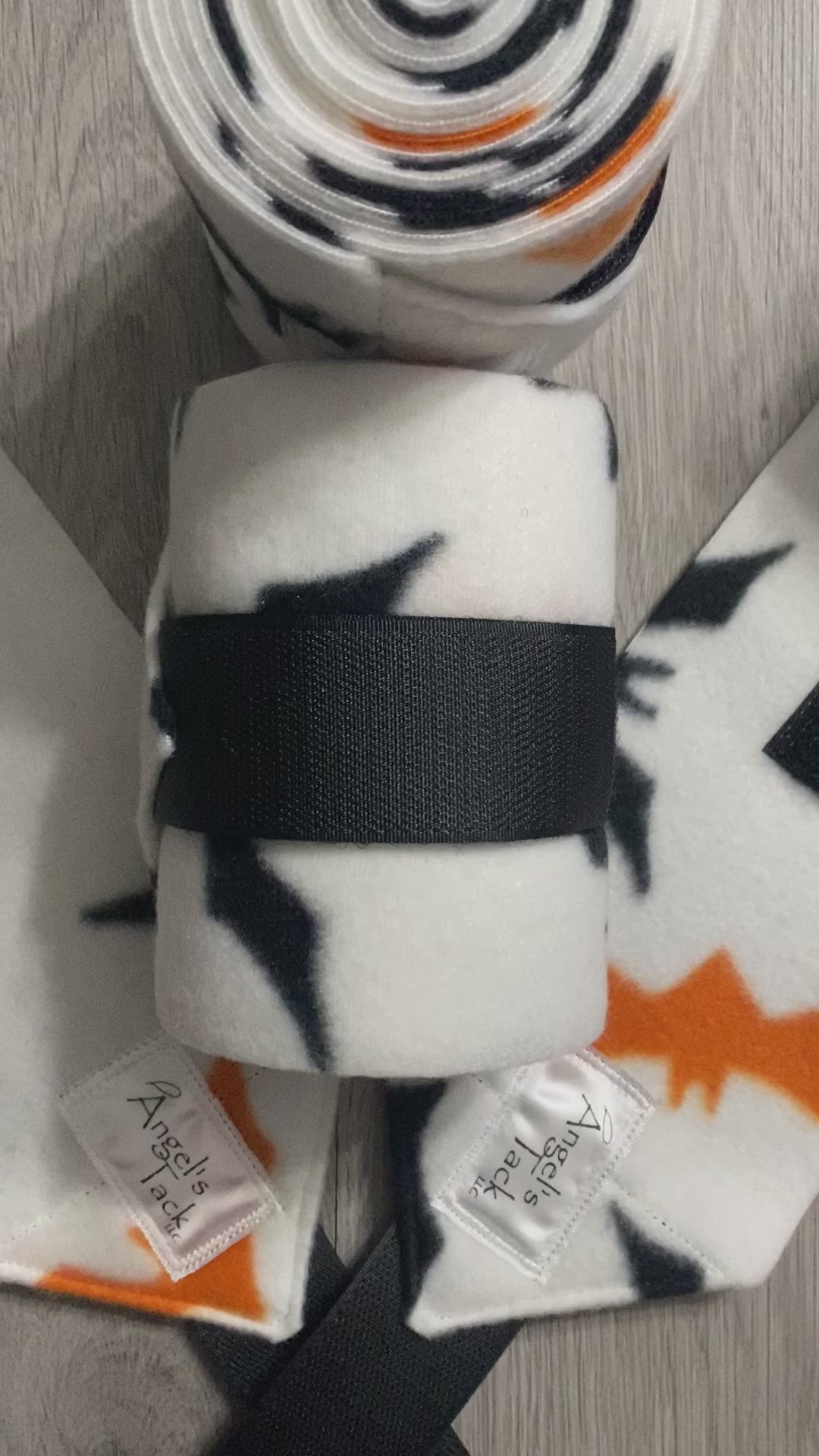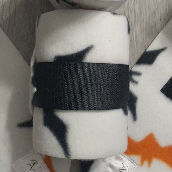 This design feature orange and black bats on white fleece. These polos measure 4.5 inches wide by 9ft long. Give your horse added protection while working or trailering. Produced with heavy duty Velcro. Set of four. Handmade in the USA.