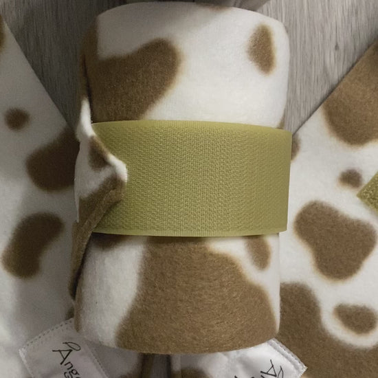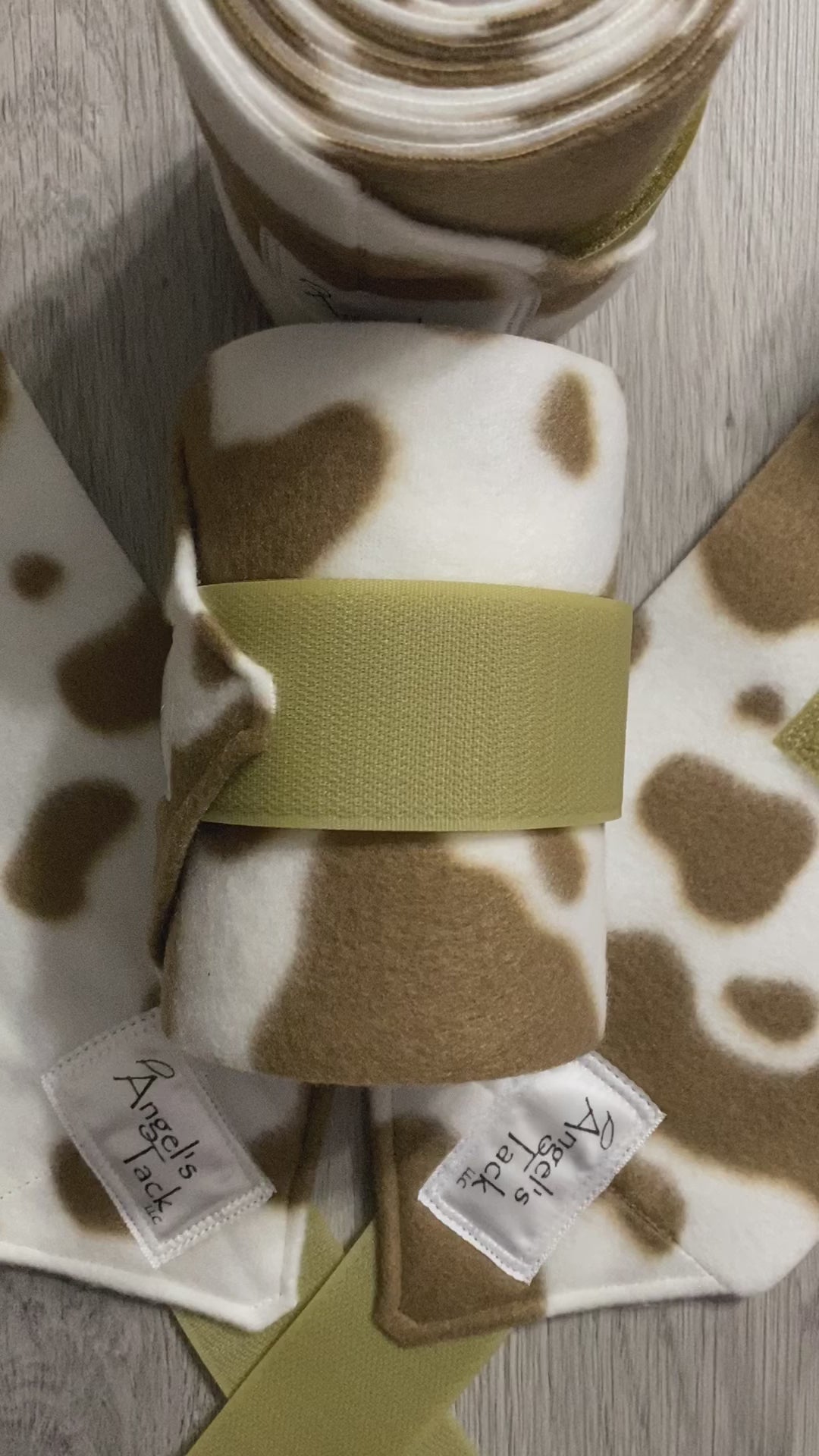 These brown bow print polo wraps measure 4.5 inches wide by 9ft long. Give your horse added protection while working or trailering. Produced with heavy duty velcro. Set of four. Handmade in the USA.