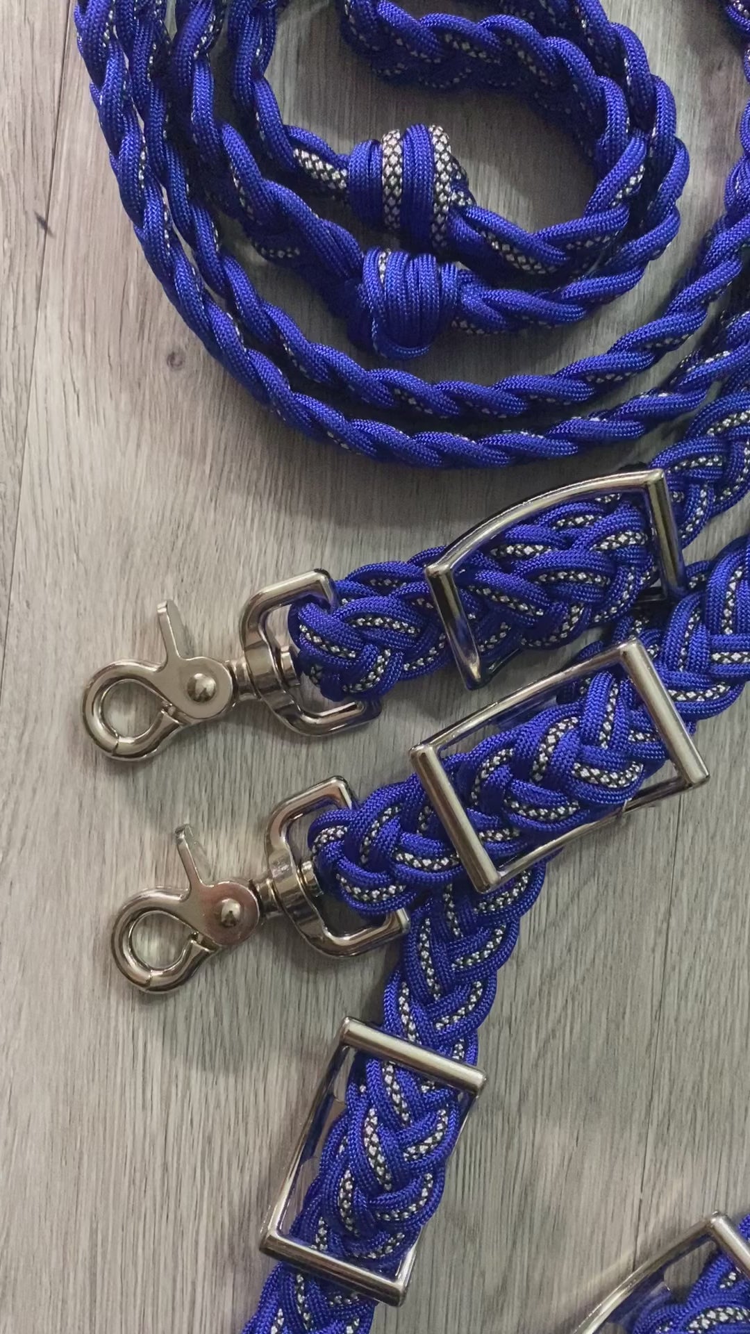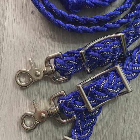 'Royal Blue Diamond' is a diamond patterned cord outlined in royal blue. These hand braided reins feature durable, mold/mildew resistant, 9 strand, 550 paracord. Choose a flat braid or four knots for easy hand placement. The reins can be adjusted with the included conways and have trigger snaps for easy attachment. 1 inch wide. Available in various sizes. Heavy duty nickel plated hardware. Handmade in the USA.