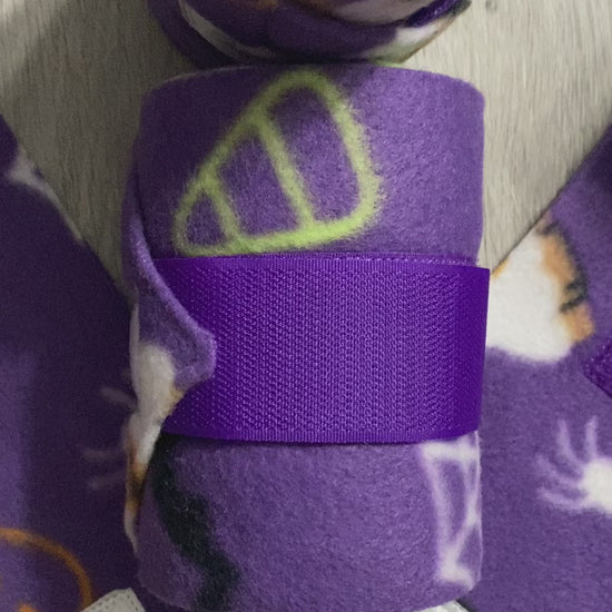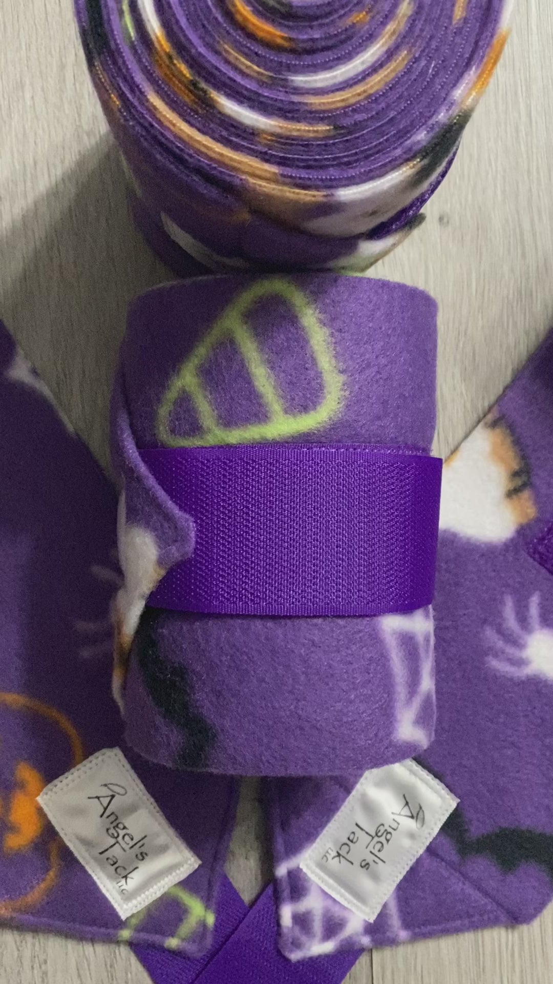 Halloween polo wraps with Halloween themed print on purple. These horse size polo wraps measure 4.5 inches wide by 9ft long. Give your horse added protection while working or trailering. Produced with heavy duty velcro. Set of four. Handmade in the USA.